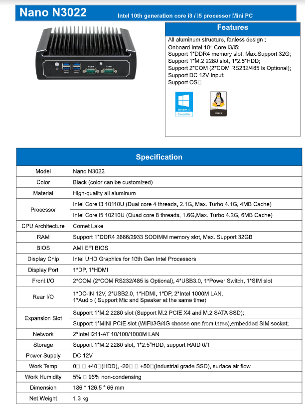 Ultra Compact Fanless PC (Nano N3022)